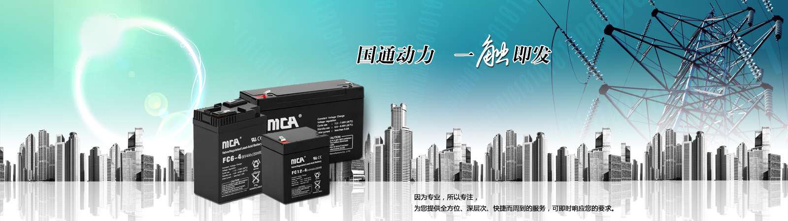 廣東中商國通MCA蓄電池創立于2001年8月,是專注鉛酸蓄電池的研制、開發、制造和銷售的高新科技企業,MCA蓄電池公司主導產品為通信用電池、動力電池、光伏儲能用電池、高功率電池。 MCA電池產品廣泛應用于通信、電力、金融、鐵路等基礎性產業;太陽能、風能、智能電網、電動汽車、儲能電站等戰略性新興產業。MCA蓄電池經過十余年的發展,MCA公司已成為國內外知名的電池制造商。